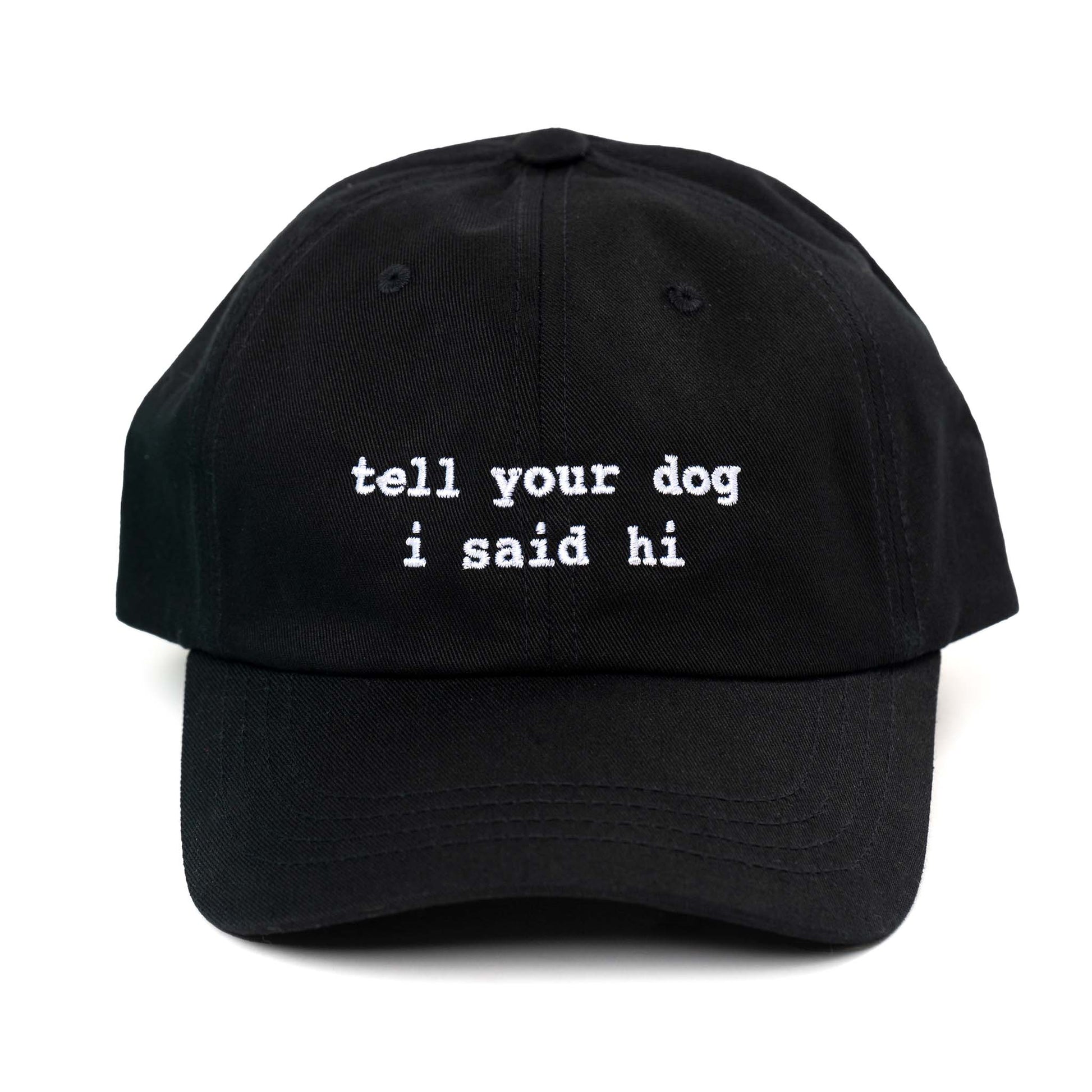 - "tell your dog i said hi" embroidered across the front
