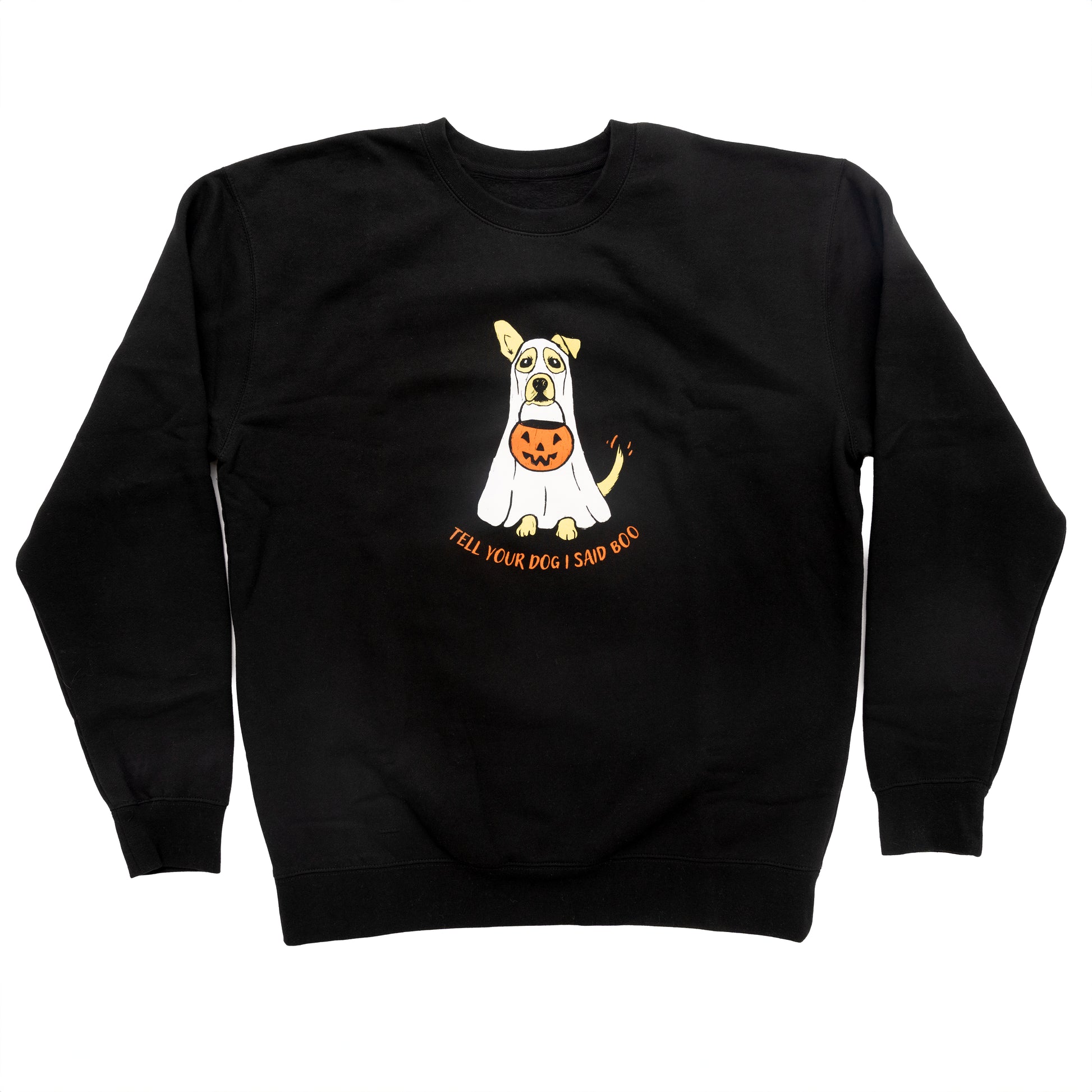 - tell your dog i said boo printed on the front with a spooky ghost dog
