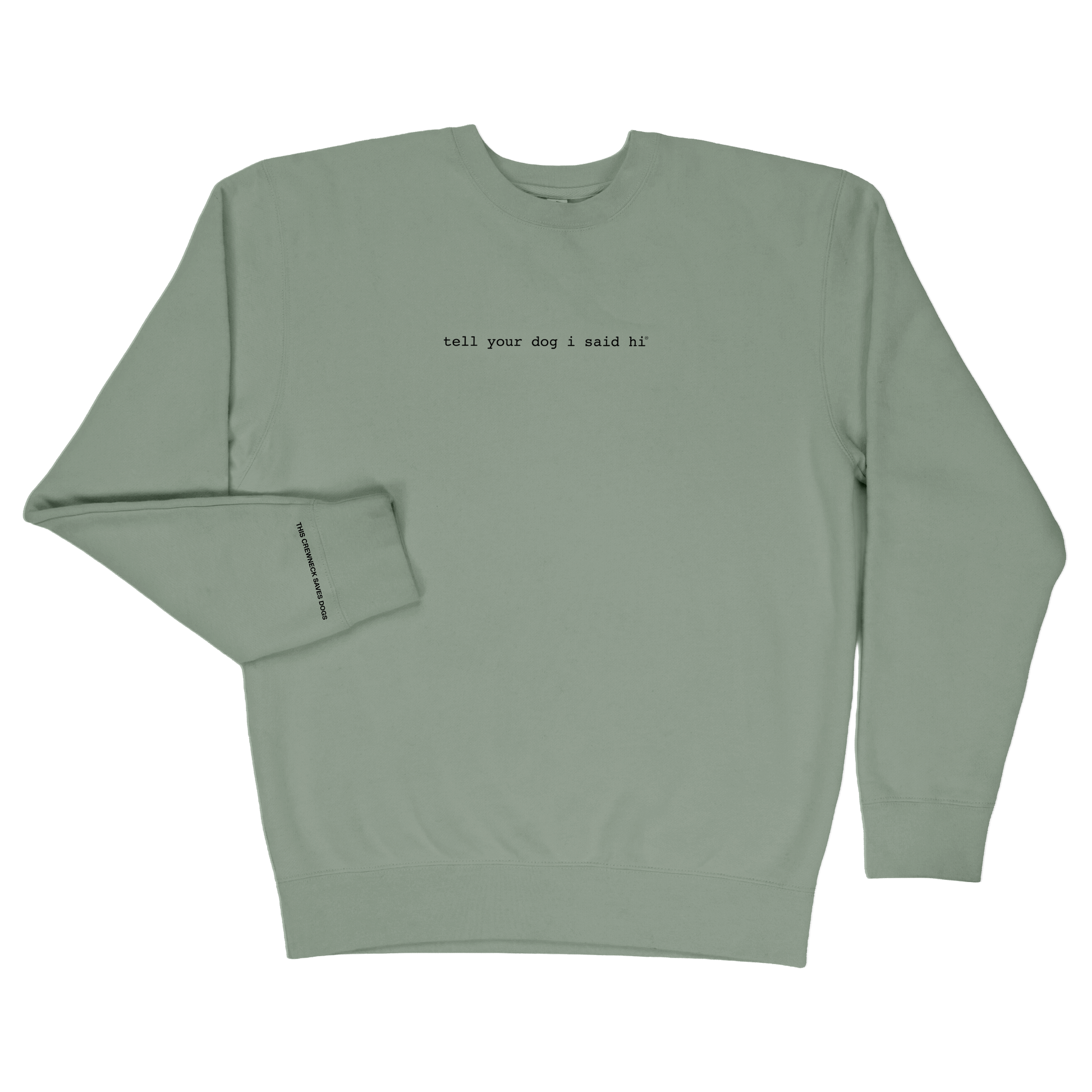 - "THIS CREWNECK SAVES DOGS" in small print on the right wrist (not pictured)