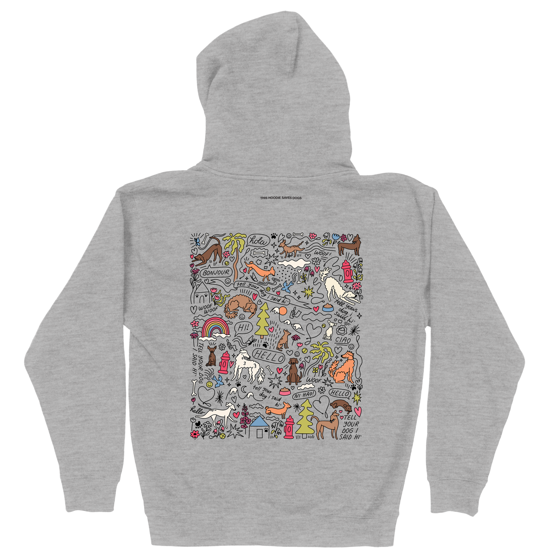 - "THIS HOODIE SAVES DOGS" in small print on the back (under the hood!)