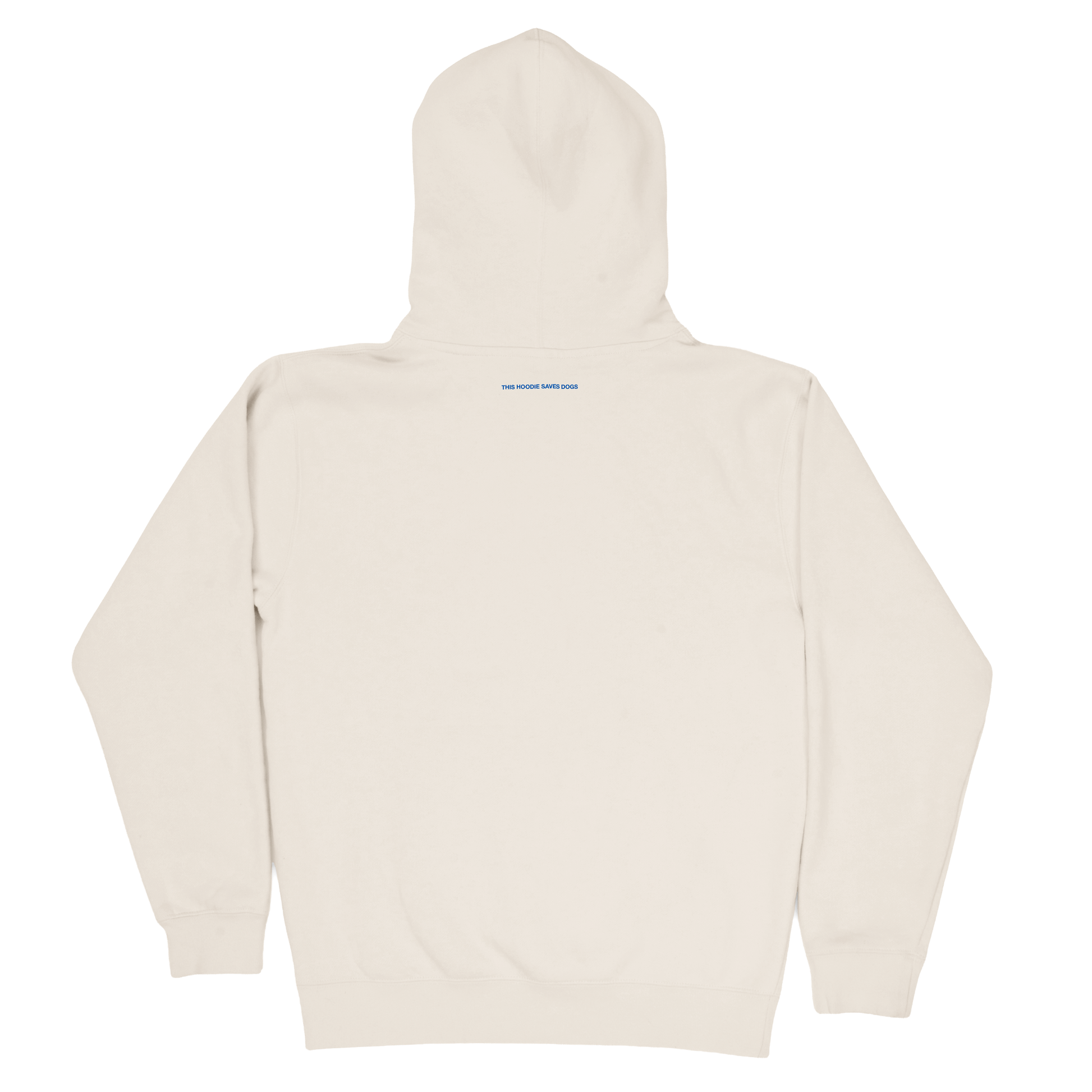- "THIS HOODIE SAVES DOGS" in small print on the back (under the hood!)