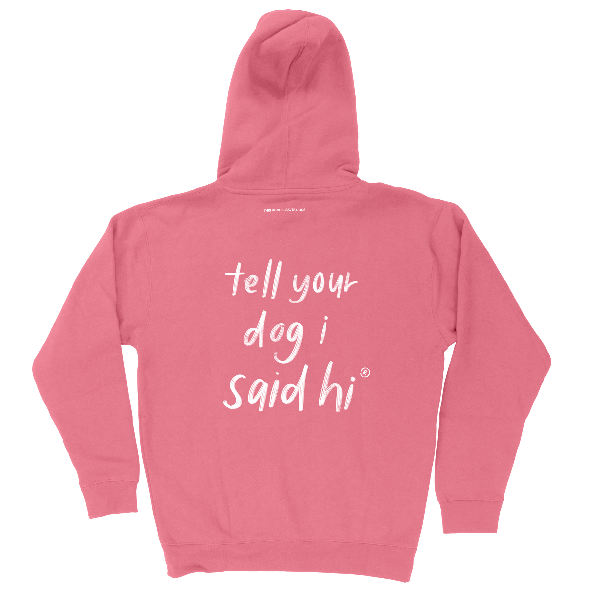 - "THIS HOODIE SAVES DOGS" in small print on the back (under the hood!)