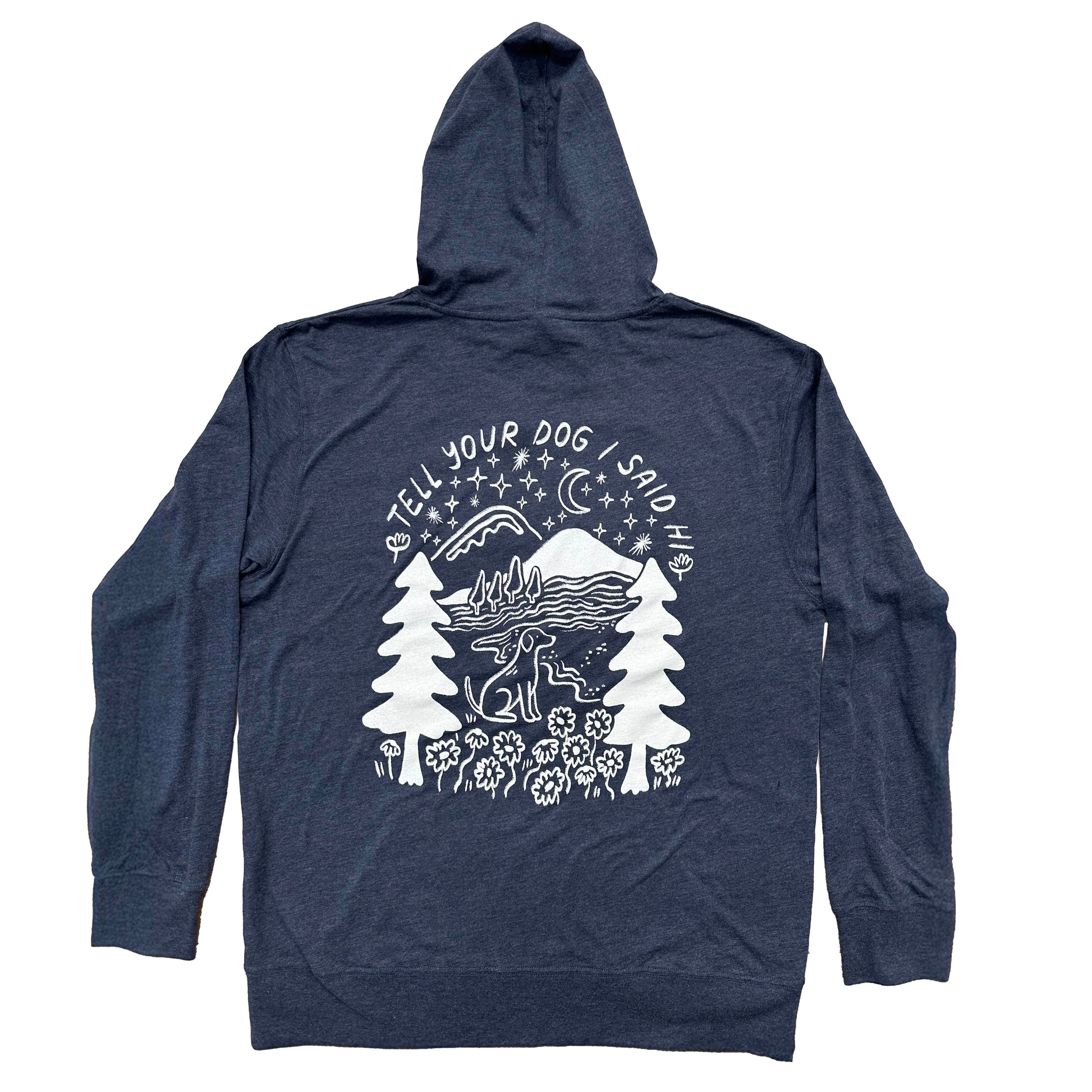 - "THIS HOODIE SAVES DOGS" in small print on the back (under the hood!)
